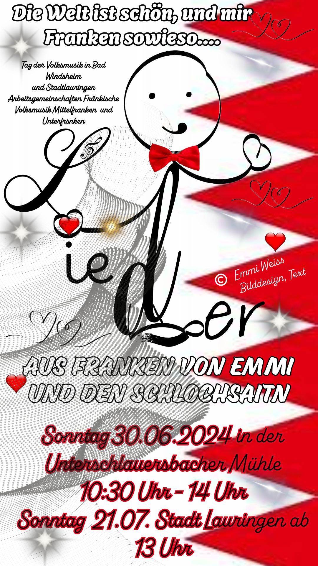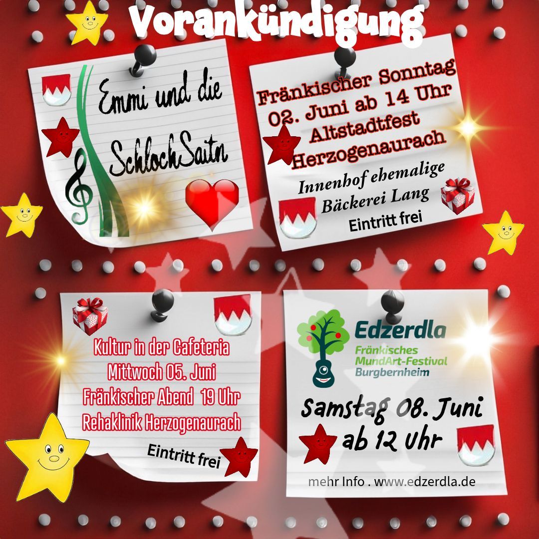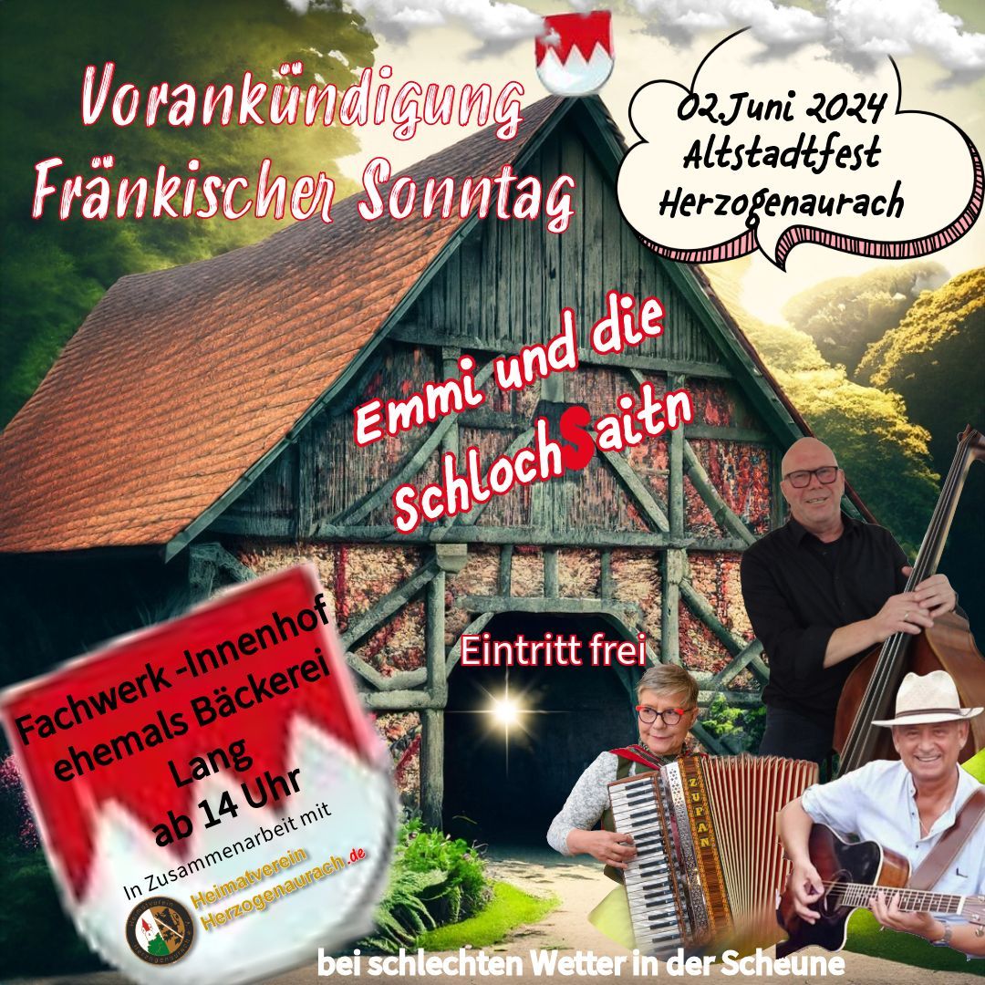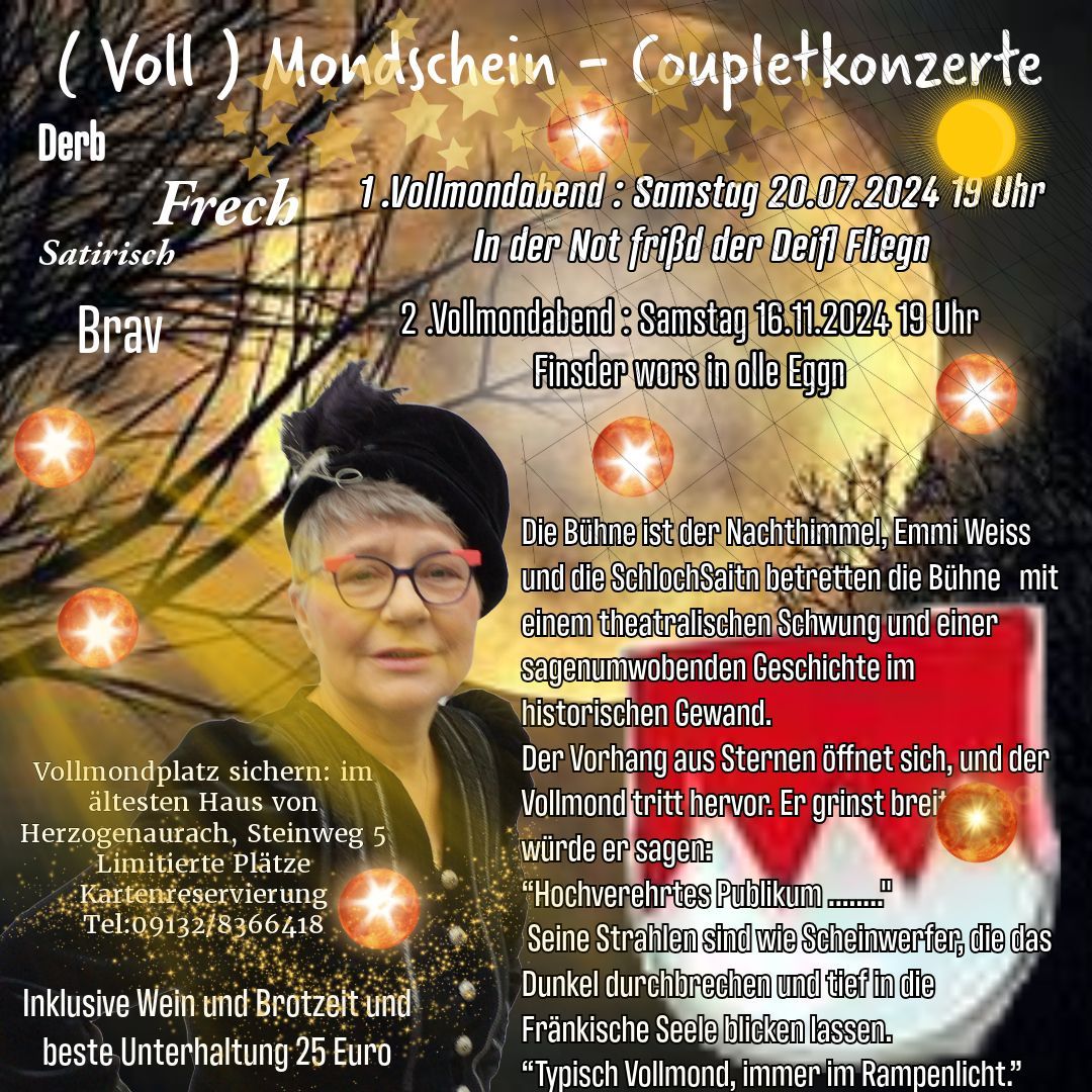 Fränkische Volkslieder,Uralte, alte aber auch Tradimix sind der wichtigste Teil des kulturellen Erbes der Region und unser bestreben. Zum Erhalt der Fränkischen Wirtshauskultur die Emmi Weiss ins Leben gerufen hat, haben wir uns zur Aufgabe- Passion gemacht die Werdshäuser und Brauereien mit unseren Kabarett, Couplets und Musikabenden zu unterstützen.